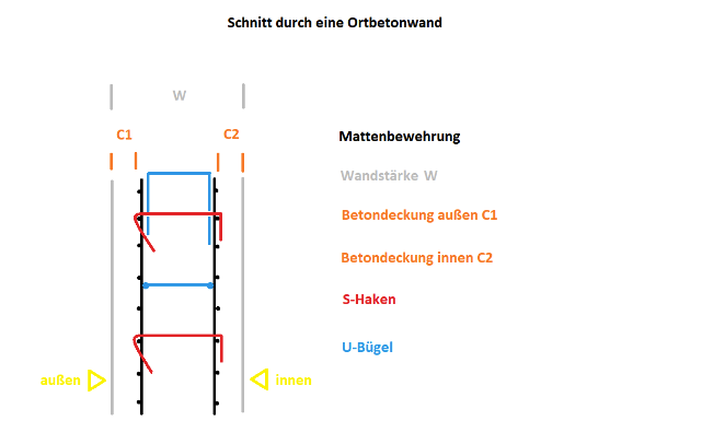 Beim Bewehren von Ortbetonwänden werden als Grundbewehrung gerne Baustahlmatten verwendet, da diese als Gitter schon eine eigene Steifigkeit haben. Der metallische Abstandhalter einer Ortbetonwand heißt S-Haken und umschließt die komplette Grundbewehrung. Die S-Haken werden laut schematischer Darstellung eingebaut. Berechnet wird die Höhe der S-Haken wie im vorliegenden Beispiel.