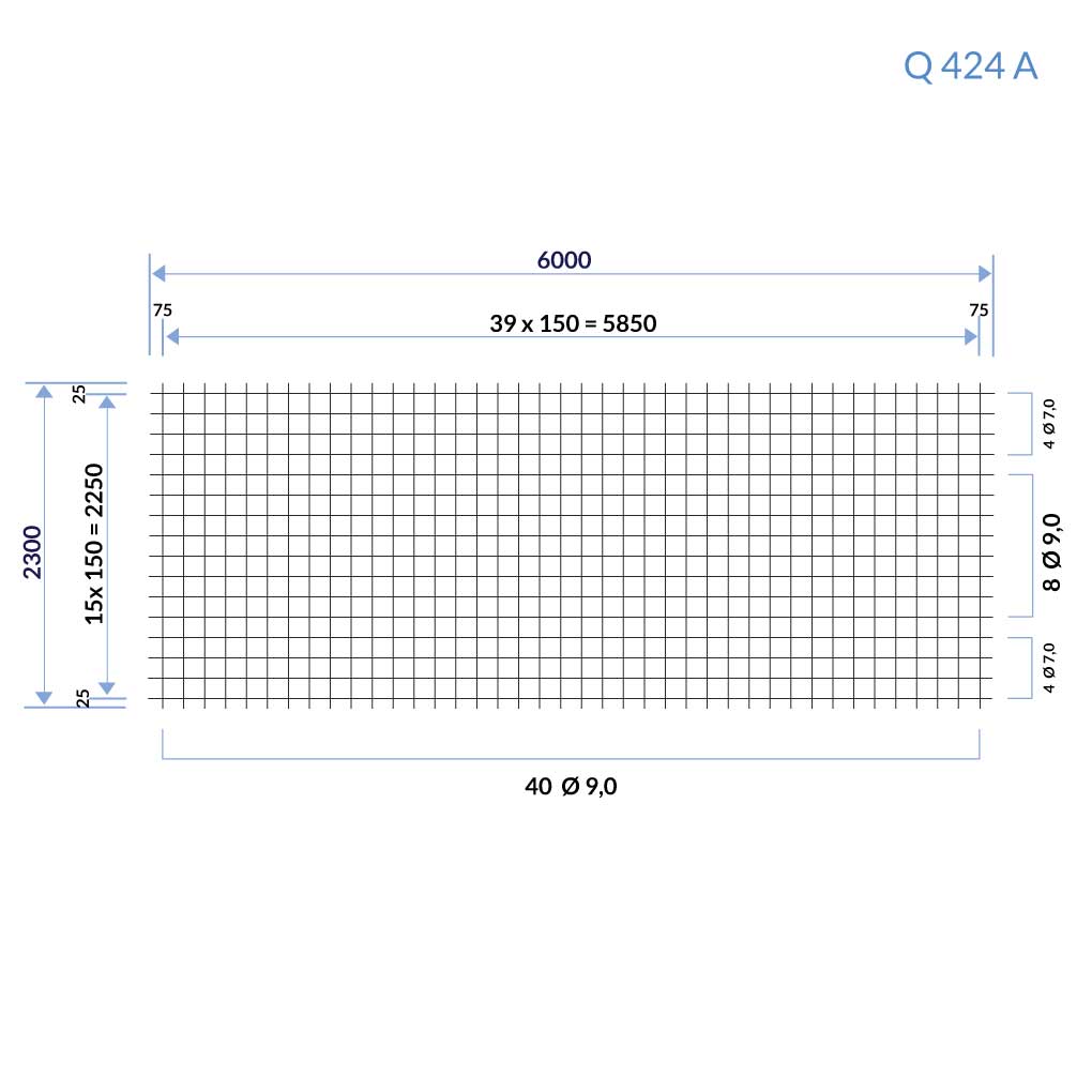 Die Baustahlmatte Q424A besticht durch ihre technischen Eigenschaften, die höchsten Ansprüchen gerecht werden. Mit einem Gewicht von 6,12 kg/m² und einer Maschenweite von 150 x 150 mm bietet sie optimale Stabilität und Flexibilität zugleich. Das Material der Q424A entspricht der Stahlgüte B500A und erfüllt somit die strengen DIN-Normen.