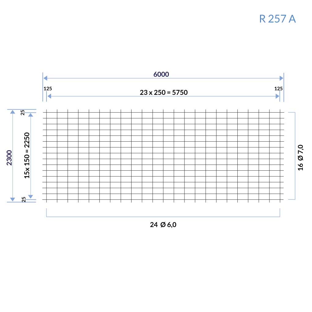 Ein wichtiger Aspekt der R257A ist die Maschenweite von 150 x 250 mm, die eine effektive Verteilung der Kräfte im Beton ermöglicht. Das Gewicht der Matte beträgt ca.41,2 kg/Stück, was eine einfache Handhabung auf der Baustelle gewährleistet.